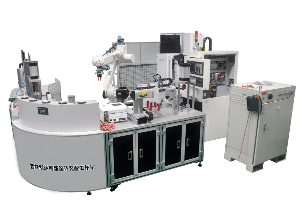 系統是一個將智能制造系 統進行獨立工作島式設計的教 學應用實踐平臺,是可用于學 習集成實踐和創(chuàng)新設計的綜合 性教學平臺。工作站集成融合 了創(chuàng)新設計、智能識別、數控 加工、機器人搬運、零部件裝 配、數字化信息軟件為一體的 集成單元,適用于多學科融合 交叉應用實踐,通過平臺將智 能制造關鍵技術進行全方位體 現.可以通過信息化手段進行 數控機床數據信息監(jiān)控、工業(yè) 機器人動作狀態(tài)與信息監(jiān)控, 并配套可視化看板對系統數據 進行統一展示。