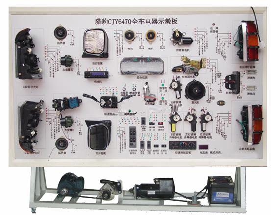 獵豹CJY6470全車電器實訓(xùn)臺 1.實訓(xùn)臺采用柴油車元件制作,近似原車的布置方式;主要由全車線束、儀表盤、各種開關(guān)、燈光系統(tǒng)、加熱、繼電器、燃油供給系統(tǒng)、燃油分配泵、發(fā)電機、起動機、可移動式臺架。